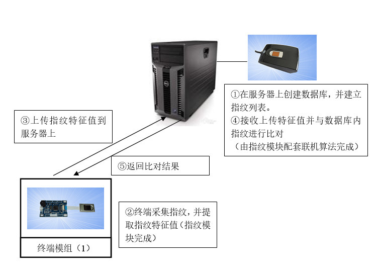 說明:本方案要求在終端采集指紋,處理成特征值數據,上傳到服務器中,與數據庫中的所有指紋進行比對,并返回比對結果給終端機。