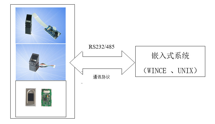 說明:在嵌入式系統(tǒng)(WINCE 、UNIX)中,模塊可以通過串口,不需要驅(qū)動(dòng),在ARM平臺(tái)上只要做一些簡(jiǎn)單的指令調(diào)用,就可以通過ARM平臺(tái)及軟件對(duì)模塊進(jìn)行發(fā)送命令,采集、比對(duì)、存儲(chǔ)等等各操作,實(shí)現(xiàn)嵌入式系統(tǒng)的指紋集成